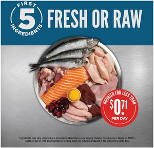 - The first five ingredients come from fresh or raw animal sources, including chicken, wild-caught salmon and rabbit for a tasty meal packed with 16 total fresh or raw ingredients.