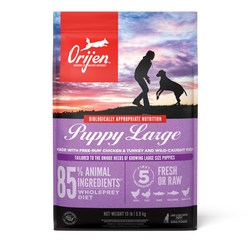 ORIJEN Large Breed Puppy Food is an 85/15 formula! Meaning that 85% of each is meat and 15% is other essential ingredients. ORIJEN maintains their core concepts of Grain free, high quality natural ingredients and only using free range proteins. The first 5 ingredients are fresh (never frozen) meats, perfect proportions of nutrients and the over-all taste and digestibility is improved. This formula is packed with essential proteins and fats that will help your new best friend grow into a healthy adult!