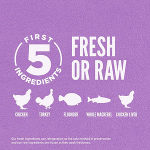 Deboned chicken, deboned turkey, yellowtail founder, whole eggs, whole atlantic mackerel, chicken liver, turkey liver, chicken heart, turkey heart, whole atlantic herring, dehydrated chicken, dehydrated turkey, dehydrated mackerel, dehydrated chicken liver, dehydrated turkey liver, whole green peas, whole navy beans, red lentils, chicken necks, chicken kidney, pinto beans, chickpeas, green lentils, natural chicken flavor, lentil fiber, herring oil, ground chicken bone, chicken cartilage, chicken fat, turkey cartilage, dried kelp, freeze-dried chicken liver, freeze-dried turkey liver, whole pumpkin, whole butternut squash, kale, spinach, mustard greens, collard greens, turnip greens, whole carrots, apples, pears, pumpkin seeds, sun?ower seeds, zinc proteinate, mixed tocopherols (preservative), chicory root, turmeric, sarsaparilla root, althea root, rosehips, juniper berries, dried lactobacillus acidophilus fermentation product, dried bi?dobacterium animalis fermentation product, dried lactobacillus casei fermentation product.