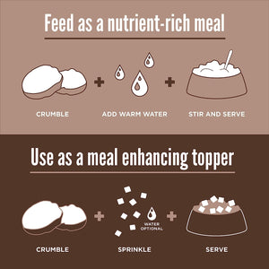 This Freeze-Dried formula can be used as a complete meal, or as a topper. Raw diets have been long term benefits and the more raw foods you can introduce into your dogs diet, the better!