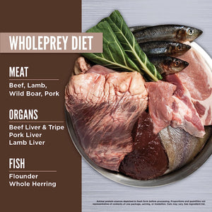 Beef, beef liver, lamb, wild boar, flounder, pork, beef tripe, pork liver, whole herring, lamb liver, pea fiber, bison, lamb tripe, lamb kidney, whole pumpkin, collard greens, whole apples, whole carrots, whole pears, calcium carbonate, bison kidney, bison liver, bison tripe, salt, dried kelp, choline chloride, zinc proteinate, manganese proteinate, copper proteinate, calcium pantothenate, vitamin E supplement, mixed tocopherols (preservative), riboflavin, folic acid, thiamine mononitrate, pyridoxine hydrochloride, rosemary extract, citric acid (preservative).