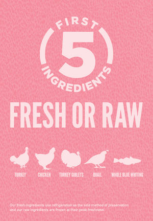 Deboned turkey, deboned chicken, quail, eggs, whole blue whiting, whole Atlantic mackerel, turkey liver, chicken liver, turkey heart, chicken heart, dehydrated turkey, dehydrated chicken, dehydrated mackerel, dehydrated chicken liver, dehydrated egg, whole red lentils, whole pinto beans, whole green lentils, chicken fat, whole navy beans, whole chickpeas, lentil fiber, pea starch, natural chicken flavor, pollock oil, turkey cartilage, chicken cartilage, freeze-dried chicken liver, New Zealand green mussels, whole cranberries, whole pumpkin, collard greens, carrots, apples, dried kelp, zinc proteinate, salt, mixed tocopherols (preservative), thiamine mononitrate, calcium pantothenate, copper proteinate, chicory, turmeric, sarsaparilla, althea root, rosehips, juniper berries, citric acid (preservative), rosemary extract, dried Lactobacillus acidophilus fermentation product, dried Bifidobacterium animalis fermentation product, dried Lactobacillus casei fermentation product.