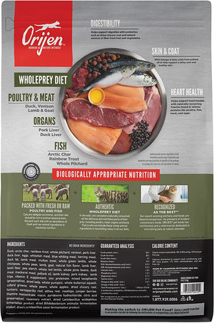 - WholePrey diet featuring the most succulent parts of the prey including duck, meat and fish, organs and bone.