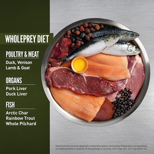 Duck, Whole Arctic Char, Steelhead Trout, Whole Pilchard, Venison, Pork Liver, Duck Liver, Eggs, Whitefish Meal, Blue Whiting Meal, Herring Meal, Duck Fat, Lamb Meal, Mutton Meal, Whole Green Lentils, Whole Chickpeas, Whole Peas, Lamb, Goat, Natural Fish Flavor, Lamb Liver, Lentil Fiber, Pea Starch, Whole Red Lentils, Whole Pinto Beans, Duck Meal, Mackerel Meal, Pollock Oil, Lamb Kidney, Pork Kidney, Lamb Tripe, Vitamin E Supplement, Zinc Proteinate, Mixed Tocopherols (Preservative), Dried Kelp, Whole Pumpkin, Whole Butternut Squash, Collard Greens, Whole Pears, Whole Apples, Freeze-Dried Goat, Freeze-Dried Venison, Dried Chicory Root, Turmeric, Sarsaparilla Root, Althea Root, Rosehips, Juniper Berries, Thiamine Mononitrate, Niacin, Pyridoxine Hydrochloride, Citric Acid (Preservative), Rosemary Extract, Dried Lactobacillus Acidophilus Fermentation Product, Dried Bifidobacterium Animalis Fermentation Product, Dried Lactobacillus Casei Fermentation Product.