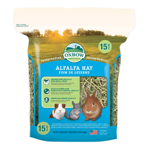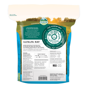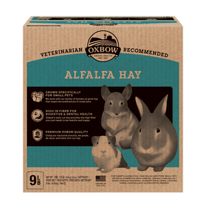 Oxbow Alfalfa Hay is high fiber legume hay that small animals like rabbits, guinea pigs, chinchillas, tortoises and prairie dogs enjoy! It contains more crude protein, digestible energy and calcium than regular grass hay. Alfalfa Hay is a perfect choice for growing, pregnant or nursing pets and makes a wonderful treat for adults. Every of Oxbow is hand-packed, quality tested and meets the nutritional needs of your pet. Product of the USA!!
