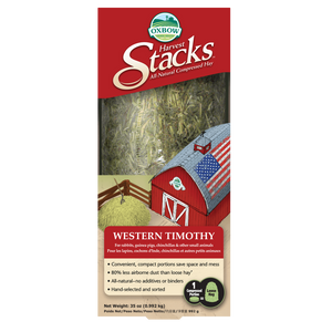 Oxbow Harvest Stacks utilize compression technology to transform 100% all-natural, long-strand, hand-sorted Western Timothy hay into compact, smaller portions which produce 80 percent less dust than loose hay would. With their compressed shape, they are easier to store and do not take up as much room as large s of hay do.