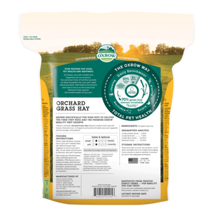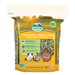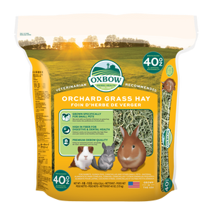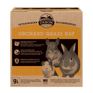 Oxbow Orchard Grass is a high fiber, low protein and low calcium grass hay that helps to keep the digestive tract functioning properly in rabbits and small herbivores. Orchard Grass has a sweet smell and leafy taste that small animals just love. It is a soft-textured grass that is a vital part of small animal diets and it not only provides nutrition, but mimics their natural habitat. Grass hay also promotes the natural chewing behavior and helps to prevent molar spurs and other dental issues that are common to small herbivores.