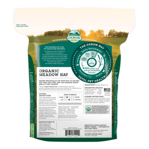 Oxbow Meadow Hay is 100% certified organic and grown naturally without the use of any chemicals or pesticides! Meadow Hay is a fragrant and flavorful combination of a variety of naturally occurring grass hays that provide a sweet and nutritious texture and fragrance that your small pet herbivore will just love!! The perfect choice for rabbits, guinea pigs, chinchillas, tortoises and other small herbivores. Make sure to offer your pet hay everyday in their diet to provide the essential fiber that they need for a healthy digestive tract!
