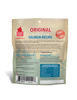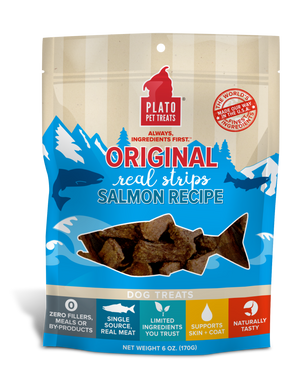 Real Strips Salmon are soft-textured, meat bars made with brown rice, are a natural source of Omega 3 & 6 fatty acids, support skin and coat health, and are just the right portion size and shape for chomping. Made with real salmon as the 1st ingredient, these treats are made with limited ingredients, are naturally preserved, and contain no artificial flavors, corn, wheat, or soy.
