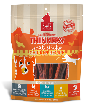 Thinkers Chicken are hearty, meat-packed sticks with added EPA and DHA to support healthy brain function. Made with real chicken as the 1st ingredient, these treats are made with limited ingredients, are naturally preserved, and contain no artificial flavors, corn, wheat, or soy.