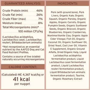 Pork (with ground bone), Pork Livers, Organic Kale, Organic Squash, Organic Parsley, Organic Apples, Organic Carrots, Organic Pumpkin Seeds, Organic Sunflower Seeds, Organic Broccoli, Organic Blueberries, Organic Cranberries, Montmorillonite Clay, Organic Apple Cider Vinegar, Fish Oil, Organic Coconut Oil, Organic Sunflower Oil, Dried Yeast, Cod Liver Oil, Vitamin E Supplement, Organic Ground Alfalfa, Dried Organic Kelp, Liquid Lactobacillus acidophilus fermentation product, Liquid Lactobacillus casei fermentation product, Liquid Lactobacillus reuteri fermentation product, Liquid Bifidobacterium animalis fermentation product, Taurine, Organic Rosemary Extract.