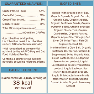 Rabbit (with ground bone), Egg, Organic Squash, Organic Carrots, Organic Kale, Organic Apples, Organic Sunflower Seeds, Organic Pumpkin Seeds, Organic Broccoli, Organic Blueberries, Organic Cranberries, Organic Parsley, Organic Apple Cider Vinegar, Cod Liver Oil, Dried Yeast, Fish Oil, Organic Coconut Oil, Montmorillonite Clay, Salt, Organic Sunflower Oil, Taurine, Vitamin E Supplement, Dried Organic Kelp, Liquid Lactobacillus acidophilus fermentation product, Liquid Lactobacillus casei fermentation product, Liquid Lactobacillus reuteri fermentation product, Liquid Bifidobacterium animalis fermentation product, Organic Ground Alfalfa, Organic Rosemary Extract