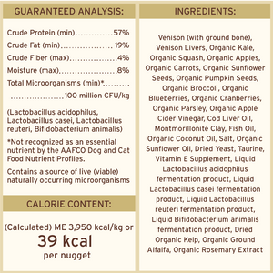 Venison (with ground bone), Venison Livers, Organic Kale, Organic Squash, Organic Apples, Organic Carrots, Organic Sunflower Seeds, Organic Pumpkin Seeds, Organic Broccoli, Organic Blueberries, Organic Cranberries, Organic Parsley, Organic Apple Cider Vinegar, Cod Liver Oil, Montmorillonite Clay, Fish Oil, Organic Coconut Oil, Salt, Organic Sunflower Oil, Dried Yeast, Taurine, Vitamin E Supplement, Liquid Lactobacillus acidophilus fermentation product, Liquid Lactobacillus casei fermentation product, Liquid Lactobacillus reuteri fermentation product, Liquid Bifidobacterium animalis fermentation product, Dried Organic Kelp, Organic Ground Alfalfa, Organic Rosemary Extract.