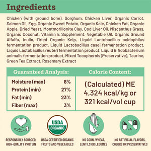 Chicken (with ground bone), Sorghum, Chicken Liver, Organic Carrot, Egg, Organic Sweet Potato, Salmon Oil, Organic Kale, Chicken Fat, Organic Apple, Dried Yeast, Montmorillonite Clay, Miscanthus Grass, Organic Coconut, Cod Liver Oil, Vitamin E Supplement, Vegetable Oil, Organic Ground Alfalfa, Inulin, Dried Organic Kelp, Liquid Lactobacillus acidophilus fermentation product, Liquid Lactobacillus casei fermentation product, Liquid Lactobacillus reuteri fermentation product, Liquid Bifidobacterium animalis fermentation product, Mixed Tocopherols (Preservative), Taurine, Green Tea Extract, Rosemary Extract