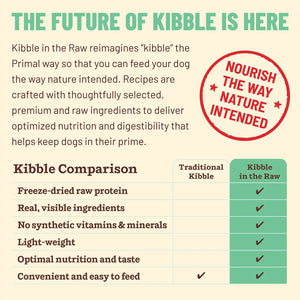 Kibble in the Raw reimagines “kibble” the Primal way so that you can feed your dog the way nature intended. Recipes are crafted with thoughtfully selected, premium and raw ingredients to deliver optimized nutrition and digestibility while providing the same scoop and serve feeding experience as kibble.