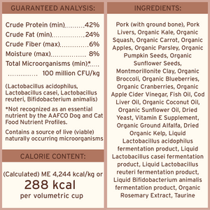 Pork (with ground bone), Pork Livers, Organic Kale, Organic Squash, Organic Carrot, Organic Apples, Organic Parsley, Organic Pumpkin Seeds, Organic Sunflower Seeds, Montmorillonite Clay, Organic Broccoli, Organic Blueberries, Organic Cranberries, Organic Apple Cider Vinegar, Fish Oil, Cod Liver Oil, Organic Coconut Oil, Organic Sunflower Oil, Dried Yeast, Vitamin E Supplement, Organic Ground Alfalfa, Dried Organic Kelp, Liquid Lactobacillus acidophilus fermentation product, Liquid Lactobacillus casei fermentation product, Liquid Lactobacillus reuteri fermentation product, Liquid Bifidobacterium animalis fermentation product, Organic Rosemary Extract, Taurine
