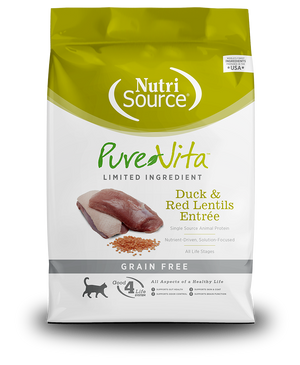 - As a member of our grain free series of cat foods, NutriSource Pure Vita Grain Free Duck & Red Lentils Entrée Cat Food is formulated to meet AAFCO guidelines for all life stages.