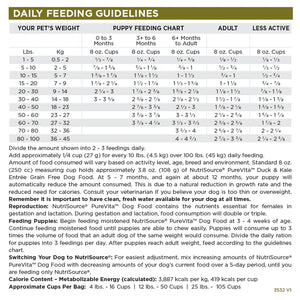 Feeding Puppies: Begin feeding moistened NutriSource® PureVita™ Dog Food at 3 - 4 weeks of age. Continue feeding moistened food until puppies are able to chew easily. Puppies will consume up to 3 times the volume of food that an adult dog of the same weight would consume. Divide the daily ration for puppies into 3 feedings per day. After puppies reach adult weight, feed according to the adult guidelines chart.