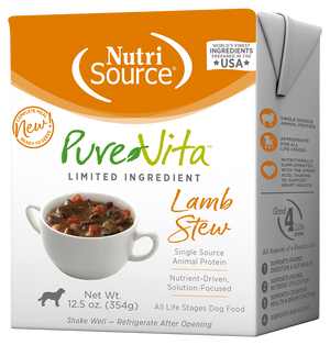 NutriSource PureVita Stews feature meat rich, single source animal protein dense recipes. Wet dog foods are a good additional source of hydration for your pet.