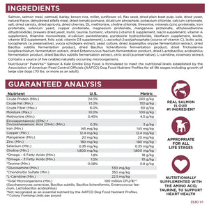 Salmon, salmon meal, oatmeal, barley, brown rice, millet, sunflower oil, flax seed, dried plain beet pulp, kale, dried yeast, natural flavor, dehydrated alfalfa meal, dried tomato pomace, dicalcium phosphate, potassium chloride, calcium carbonate, salt, dried carrots, dried apricots, dried cherries, DL methionine, choline chloride, threonine, minerals (zinc proteinate, iron proteinate, selenium yeast, copper proteinate, magnesium proteinate, manganese proteinate, ethylenediamine dihydroiodide), inulin, brewers dried yeast, taurine, turmeric, vitamins (vitamin E supplement, niacin supplement, vitamin A supplement, thiamine mononitrate, d-calcium pantothenate, pyridoxine hydrochloride, riboflavin supplement, biotin, vitamin B12 supplement, folic acid, vitamin D3 supplement), hydrolyzed yeast, L-ascorbyl-2-polyphosphate (source of vitamin C), lactic acid, tocopherols (a preservative), yucca schidigera extract, yeast culture, dried Aspergillus oryzae fermentation extract, dried Bacillus subtilis fermentation product, dried Bacillus licheniformis fermentation product, dried Trichoderma longibrachiatum fermentation extract, dried Enterococcus faecium fermentation product, dried Lactobacillus acidophilus fermentation product, dried Bacillus subtilis fermentation extract, citric acid (a preservative), L-carnitine, rosemary extract.