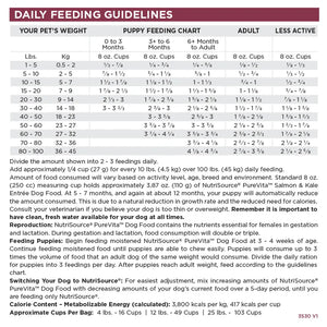 Amount of food consumed will vary based on activity level, age, breed and environment. Standard 8 oz. (250 cc) measuring cup holds approximately 3.87 oz. (110 g) of NutriSource® PureVita™ Salmon & Kale Entrée Dog Food. At 5 - 7 months, and again at about 12 months, your puppy will automatically reduce the amount consumed. This is due to a natural reduction in growth rate and the reduced need for calories. Consult your veterinarian if you believe your dog is too thin or overweight. Remember it is important to have clean, fresh water available for your dog at all times.