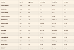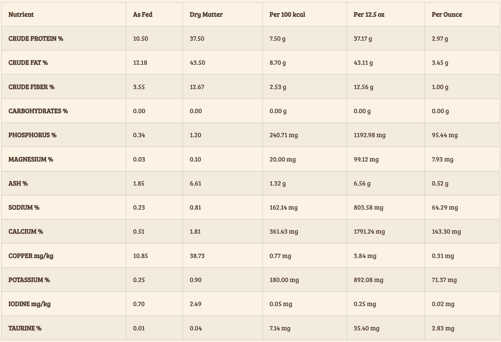 Beef, Beef Broth, Beef Liver, Goat's Milk, Fenugreek Seeds, Sunflower Lecithin, Dicalcium Phosphate, Salt, Potassium Chloride, Calcium Carbonate, Sunflower Oil (Preserved with Mixed Tocopherols), Salmon Oil (preserved with Mixed Tocopherols), Choline Chloride, Thiamine Mononitrate, Taurine, Zinc Proteinate, Iron Proteinate, Magnesium Sulfate, Vitamin E Supplement, Vitamin A Supplement, Copper Proteinate, Niacin Supplement, Calcium Pantothenate, Manganese Proteinate, Sodium Selenite, Vitamin D3 Supplement, Riboflavin Supplement, Vitamin B12 Supplement, Pyridoxine Hydrochloride, Calcium Iodate, Folic Acid.
