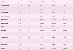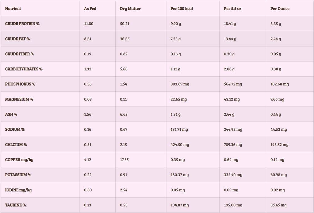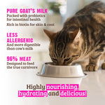 Chicken, Chicken Broth, Chicken Liver, Goat's Milk, Natural Flavor, Tricalcium Phosphate, Fenugreek Seeds, Salt, Choline Chloride, Potassium Chloride, Thiamine Mononitrate, Taurine, Dandelion Greens, Magnesium Sulfate, Zinc Proteinate, Iron Proteinate, Kelp, Niacin Supplement, Vitamin E Supplement, Copper Proteinate, Vitamin A Supplement, Manganese Proteinate, Sodium Selenite, Calcium Pantothenate, Pyridoxine Hydrochloride, Vitamin D3 Supplement, Riboflavin Supplement, Vitamin B12 Supplement, Folic Acid, Calcium Iodate, Biotin.