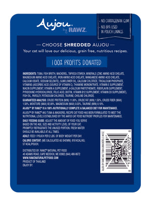 RAWZ Aujou Adult Cat Shredded Aku Tuna & Mackerel in a silky broth. Minimally processed, without the use of artificial binders or gums.