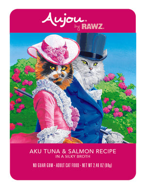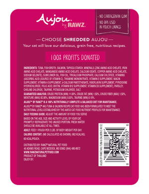 RAWZ Aujou Adult Cat Shredded Aku Tuna & Salmon in a silky broth. Minimally processed, without the use of artificial binders or gums.