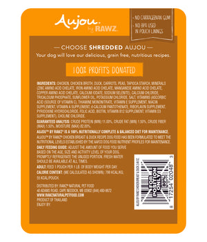 RAWZ Aujou Adult Dog Shredded Chicken Breast & Duck in a silky sauce. Food is nutritionally complete for your adult cat and are in convenient pouches for easy opening and feeding.