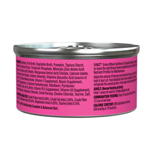 Sardines, Fish Bone Broth, Vegetable Broth, Pumpkin, Tapioca Starch, Sunflower Oil, Natural Flavor, Tricalcium Phosphate, Minerals (Zinc Amino Acid Chelate, Iron Amino Acid Chelate, Manganese Amino Acid Chelate, Calcium Iodate, Copper Amino Acid Chelate, Sodium Selenite), Vitamins (Ascorbic Acid (source of Vitamin C), Thiamine Mononitrate, Vitamin E Supplement, Niacin Supplement, Vitamin A Supplement, d-Calcium Pantothenate, Riboflavin, Pyridoxine Hydrochloride, Folic Acid, Biotin, Vitamin B12 Supplement, Vitamin D3 Supplement), Calcium Chloride, Potassium Chloride, Dried Parsley, Choline Chloride, Taurine, Salt.