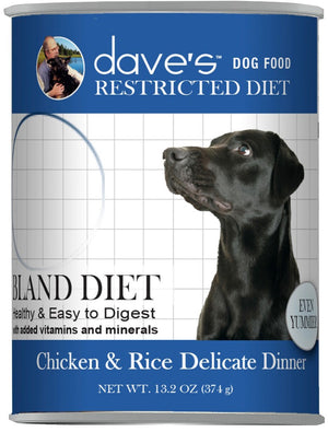 Dave’s Restricted Diet Bland Chicken and Rice Canned Dog Food is easy to digest for sensitive stomachs. A bland diet of chicken and rice designed to calm the stomach during times of transition, or for any dog prone to stomach upset that needs a simple diet that is easily digested. No wheat or wheat gluten!