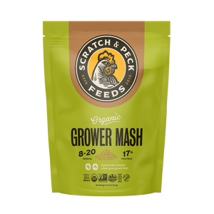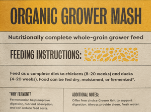 Feed Organic Grower Mash as a complete diet to chickens (8-20 weeks) and ducks (4-20 weeks). Organic Grower Mash can also be fed to mixed flocks of all ages as long as Oyster Shell is provided free choice for eggshell strength.