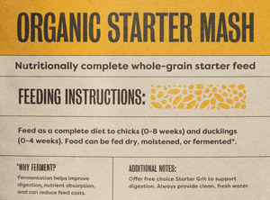 Organic Starter Mash is a fantastic formula for baby chicks and ducklings. It contains all the essential nutrients young birds need to grow strong muscles, healthy bones, and perfectly fluffy feathers. A bonus with whole grain mash: its ability to ferment for better digestibility and improved hydration!
