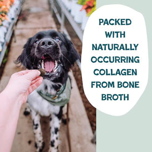 - Includes naturally occurring collagen from pork bone broth, pork hearts and whole egg to support hip, joint, bone and skin and coat support.