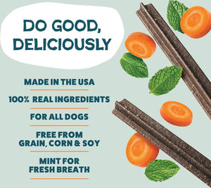 Help your pooch’s smile and fur look dazzling with Shameless Pets Carrate Chomp Dental Stick Dog Treats. These drool-worthy treats not only formulated with carrots and salmon oil to support skin and coat health—they also feature ridges to help brush off plaque, and a taste of mint to help fur-eshen your pup’s breath. Plus, these treats are made in the USA without grain, corn, soy, or artificial colors and preservatives. Chews wisely!