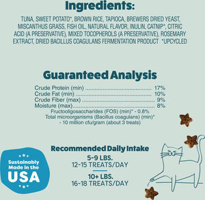 Tuna, sweet potato*, brown rice, tapioca, brewers dried yeast, flaxseed, fish oil, natural flavor, catnip, sorbic acid (a preservative), citric acid (a preservative), mixed tocopherols (a preservative), rosemary extract *upcycled.
