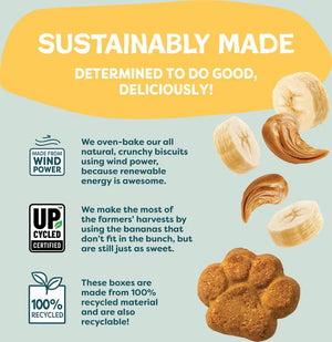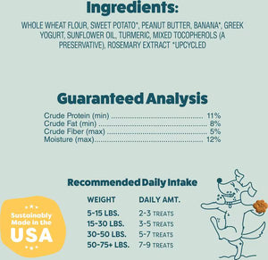 Whole Wheat Flour, Sweet Potato (Upcycled), Peanut Butter, Banana Upcycled), Greek Yogurt, Sunflower Oil, Turmeric, Mixed Tocopherols (Preservative), Rosemary Extract.