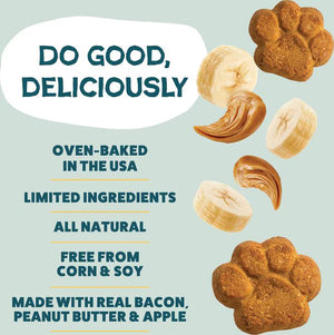 Treat your furry friend to the all-natural, oven-baked goodness of Shameless Pets Peanut Butter Split Peanut Butter & Yogurt Flavor Crunchy Dog Treats. These limited-ingredient treats are made with peanut butter, banana, and Greek yogurt for a delicious and nutritious snack. Each biscuit is made with fiber-rich, upcycled bananas that help prevent nutritious food from going to waste. These crunchy snacks are perfect for any occasion and are proudly made in the USA. Plus, they are free from corn, soy, and artificial flavors. Your pup will love these party treats!