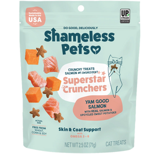 What's important to your cat is important to us. That's why we developed a treat that'll have your cat's skin & coat routine nice and shiny, without compromising taste or health. With a few bites of these Shameless Pets Yam Good Salmon Crunchy Cat Treats, they'll be doing the cat walk with perfection, from head to toe. Made with upcycled sweet potatoes, with added salmon fish oils for that extra skin & coat support, your cat will be lookin' good and feelin' good.