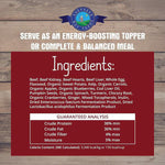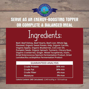 Beef, Beef Kidneys, Beef Hearts, Beef Liver, Goat Milk, Whole Egg, Flaxseed, Organic Sweet Potato, Kelp, Organic Carrots, Organic Apples, Organic Blueberries, Cod Liver Oil, Pumpkin Seeds, Organic Spinach, Chicory Root, Organic Cranberries, Ginger, Mixed Tocopherols, Inulin, Dried Enterococcus faecium, Fermentation Product, Lactobacillus acidophilus, lactobacillus casei, Bifidobacterium bifidum.
