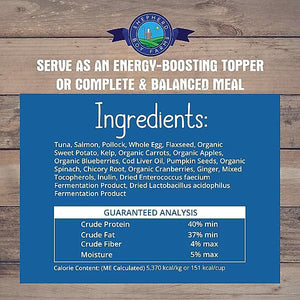 Tuna, Salmon, Pollock, Whole Egg, Goat Milk, Flaxseed, Organic Sweet Potato, Kelp, Organic Carrots, Organic Apples, Organic Blueberries, Cod Liver Oil, Pumpkin Seeds, Organic Spinach, Chicory Root, Organic Cranberries, Ginger, Mixed Tocopherols, Inulin, Lactobacillus acidophilus, lactobacillus casei, Bifidobacterium bifidum