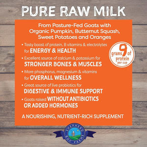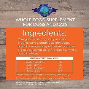 Raw Goat Milk, Organic Pumpkin, Organic Carrot, Organic Golden Beets, Organic Oranges, Organic Sweet Potato, Organic Butternut Squash, Organic Tumeric, Organic Ginger.