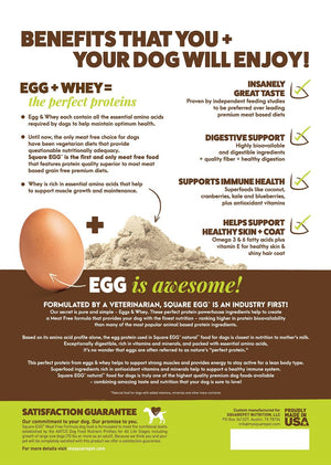 The secret to Square Egg® is pure and simple - eggs and whey. These perfect protein powerhouse ingredients help to create a vegetarian formula that provides your dog with truly superior protein nutrition. Eggs and whey each contain all the essential amino acids required by dogs for optimum growth & health and rank highest in protein bioavailability. Superfood ingredients like coconut, cranberries, kale, blueberries, plus antioxidant vitamins, and minerals plus omega 3 & 6 fatty acids support a strong, healthy immune system. Square Egg® brand food for dogs is truly one of the highest quality premium dog foods available.