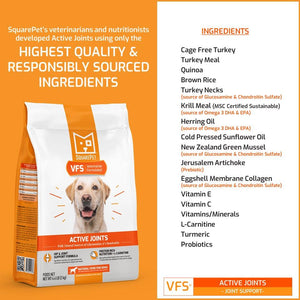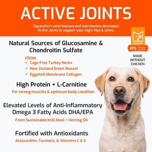 SquarePet® VFS Active Joints has been designed by SquarePet’s team of veterinary professionals to support joint health. VFS Active Joints is a high protein diet made with natural and bioavailable sources of glucosamine & chondroitin sulfate, enhanced levels of the omega 3 fatty acids DHA & EPA and fortified with antioxidants to combat oxidative stress.