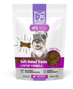 SquarePet® VFS® Low Fat Formula soft-baked treats for dogs have been developed by SquarePet’s team of veterinary professionals to support digestive health. VFS® Low Fat Formula soft-baked treats for dogs is made with naturally lean Ocean Whitefish to create a highly palatable low fat dog treat.