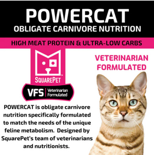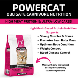 VFS POWERCAT is obligate carnivore nutrition specifically formulated to match the needs of the unique feline metabolism. VFS POWERCAT is a high meat-based protein diet paired with ultra-low carbohydrates which provides the carnivorous amino acids required by hypercarnivores to help promote strong muscles and a lean and fit body condition. VFS POWERCAT is the perfect diet for your hypercarnivorous feline!