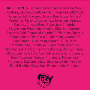 Herring, Salmon Meal, Herring Meal, Potatoes, Sunflower Oil (Preserved with Mixed Tocopherols), Flaxseed, Miscanthus Grass, Natural Vegetarian Flavor, Cranberries, Tomatoes, Apples, Carrots, Chicory Root, Potassium Chloride, Magnesium Proteinate, Choline Chloride, Taurine, Ascorbic Acid (Source of Vitamin C), Vitamins (Vitamin E Supplement, Vitamin A Supplement, Vitamin D3 Supplement, Niacin Supplement, D-Calcium Pantothenate, Riboflavin Supplement, Thiamine Mononitrate, Pyridoxine Hydrochloride, Biotin, Vitamin B12 Supplement, Folic Acid), Minerals (Zinc Proteinate, Iron Proteinate, Copper Proteinate, Manganese Proteinate, Calcium Iodate, Selenium Selenite), Salt, Dried Bacillus Coagulans Fermentation Product