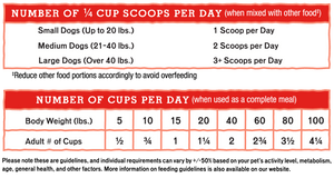 To Use As a Complete & Balanced Dinner: Our Meal Mixers are so good your dog may be begging for more! To use as a complete and balanced meal, we recommend rehydrating by adding 2 tablespoons of warm water per 1/4 cup scoop. If feeding dry, make sure your dog drinks plenty of warm water at mealtime. Optimal feeding amounts may vary with age, size, breed, and activity level. Please refer to the feeding chart below as an initial recommendation and adjust food amount as needed to reach desired weight goal.