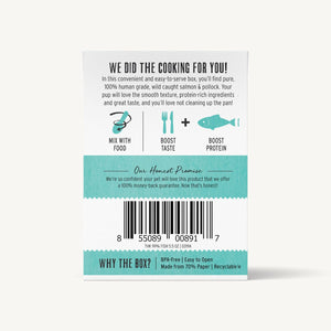 We did the cooking for you! In this convenient and easy-to-serve box, you’ll find 99% wild caught salmon and pollock. Use this protein-packed, human grade topper with their current food to boost taste and protein. Pups will love the smooth texture and juicy flavor, and you’ll love not cleaning up the pan!